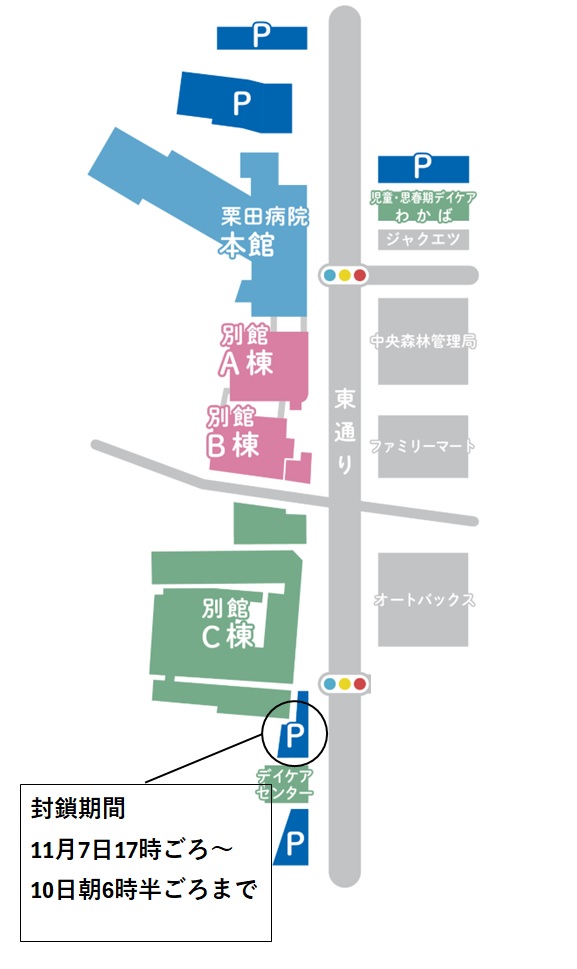 (11月7日夕がた~10日早朝)既存棟改修工事に伴うデイケア前駐車場の封鎖について