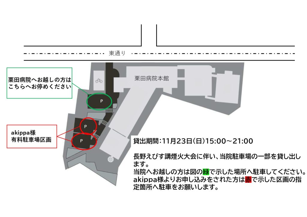 2025年11月23日(日)15時~21時において、本館駐車場のうち30台をakippaを通して臨時駐車場として貸し出します。