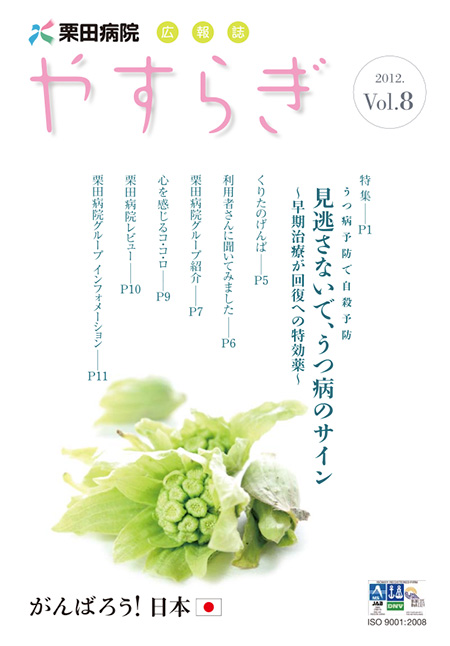 【特集】うつ病予防で自殺予防 見逃さないで、うつ病のサイン ~早期治療が回復への特効薬~【くりたのげんば】本館1階B病棟【利用者さんに聞いてみました】精神科デイケア「つばさ」【栗田病院グループ紹介】地域活動支援センター「希来里」【心を感じるコ・コ・ロ】